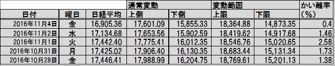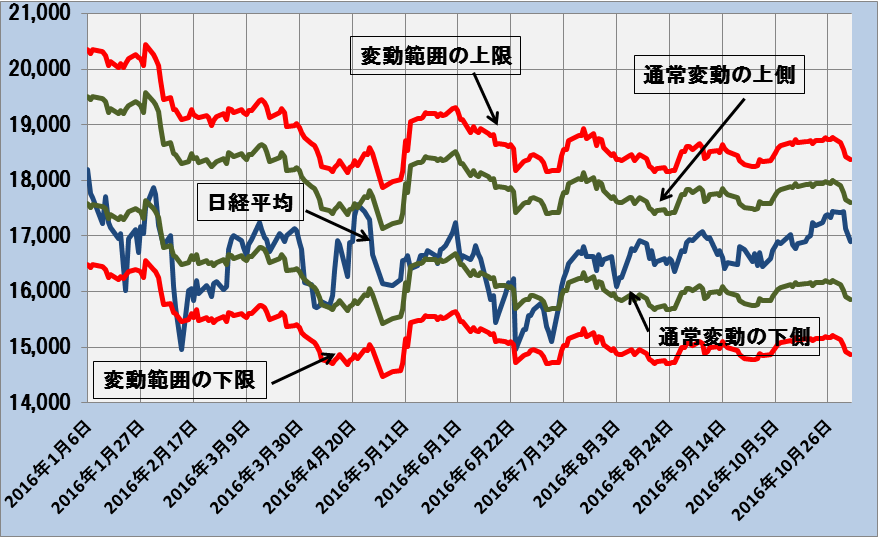 下図は、2016年6月1日から11月4日までの日経平均と理論株価、通常変動の上側と下側、そして変動の下限を示したグラフです。図中の縦線は11月1日を示します。ここから相場は急落しています。