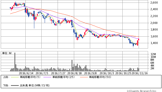 新興市場も「中立」。本日は両指数ともに堅調。昨日からようやくマザーズ指数も底打ち反転の流れに。主力のそーせいG<4565>、CYBERDYNE<7779>がともあれ決算を通過し、出尽くし感から買われる展開になりました。それに合わせてマザーズ指数も活気を帯びてきた感じ。アメリカでもトランプ大統領誕生以後売られていた「IT系」の株に買い戻しが入ったことも、安心感に繋がりました。