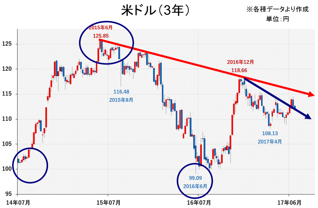 <米ドル3年間の動きでは、まだ円高傾向だが…>