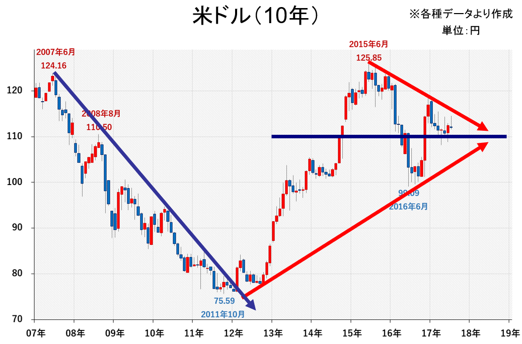 <10年間の動きでは「均衡状態」だが、円安にブレイクする直前か>