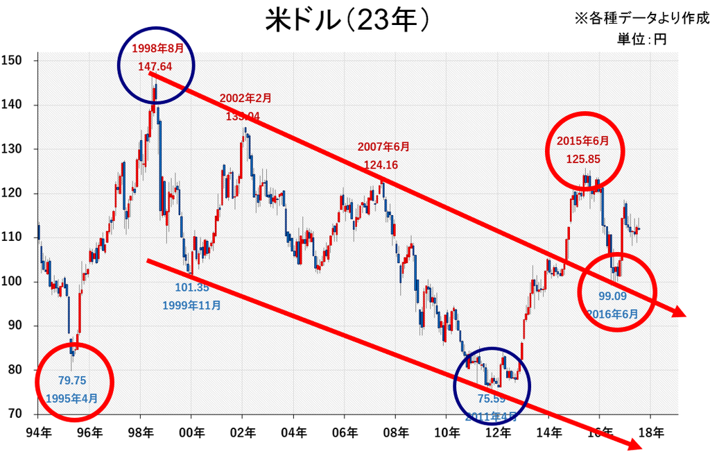 <23年間の動きでは、完全に「円安傾向」に>