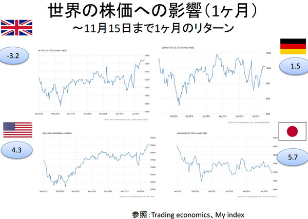 アメリカが外に出していたお金がアメリカへ戻ることになるという見方も出てきていて、これまでよかったマーケットが利喰われているというわけです。これまで買われてきたイギリスが売られ、アメリカは続伸、日本も復活、という動きが非常に象徴的です。