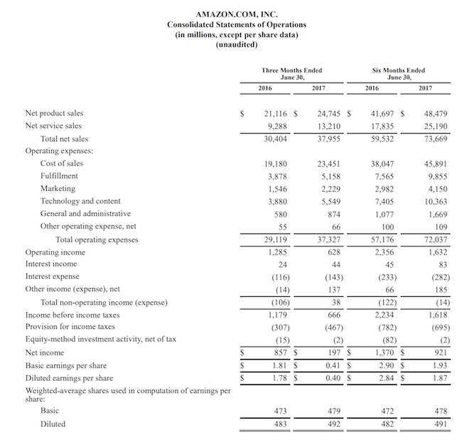 直近の四半期において$38B(約3兆8,000億円)のネット売上がありますが、$37.3B(約3兆7,300億円)の費用が計上されています。営業利益としては$628M(約628億円)、税引前利益が$666M(約666億円)、税引後の純利益が$197M(約197億円)と、ネット売上に対して非常に小さくなっていることがよく分かります。これがAmazonが利益を出さない企業と呼ばれるゆえんです。