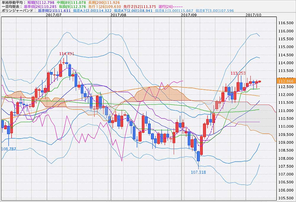 下値については、目先は一目均衡表の転換線のある112.38円近辺がポイントとなっています。雇用統計前にこの水準に近づいていればチャンスかと思いますので、軽くエントリーしても良いと思います。