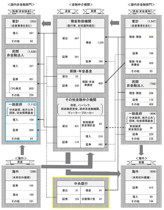- 家計、企業(民間非金融法人)、一般政府の経済の3主体と、それを仲介している金融機関の資産と負債の状況を表している