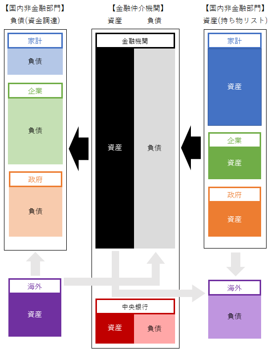 - 日本の対外債権は海外部門の負債(資金調達)であり、日本の対外債務は海外部門の資産となる