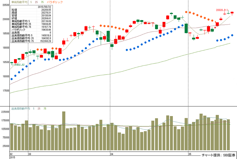 さらに、この日の上昇で日経平均株価指数のパラボリックも買い転換。テクニカル面でも好転したことで、火曜日も市場最高値更新を続ける米国株堅調と円安推移を追い風に、日経平均株価は大台2万円奪回を果たし、もう一方の株価指数でもあるTOPIXはいち早く年初来高値を更新。大型株物色が確認されています。