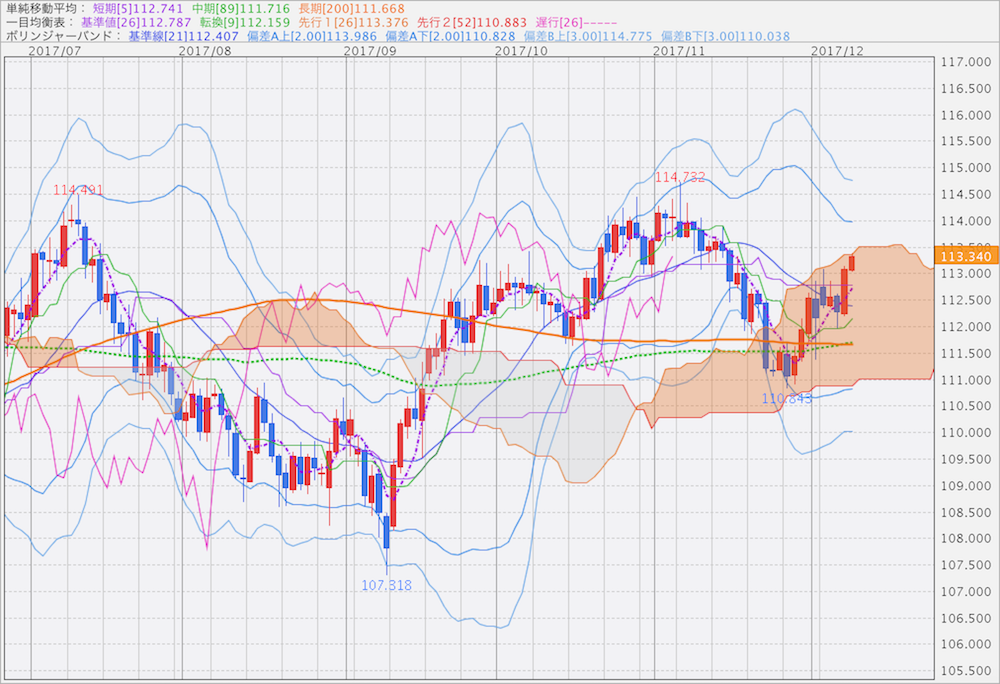 上値に関しては、113.30円台にある一目均衡表の雲・上限が攻防のポイントとなっていますので、下げて押し目で入った場合はこの手前を目処に利食いを検討しましょう。