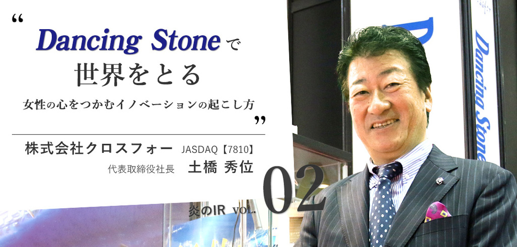 積極的な企業訪問で投資対象を見極める証券アナリスト「炎のファンドマネージャー」氏が、注目の上場企業を深掘りインタビューする「炎のIR」。第2回目の今回は、株式会社クロスフォー(証券コード:7810)の土橋秀位代表取締役社長にお話を伺った。2010年に開発した宝石のセッティング方法「Dancing Stone (ダンシングストーン)」の成功を原動力にJASDAQ上場を果たした同社は、「売上高の約3割が海外」という国内ジュエリー業界では異色の存在。なぜ「Dancing Stone」は、世界の女性の心をつかむことができたのか、秘密に迫る。