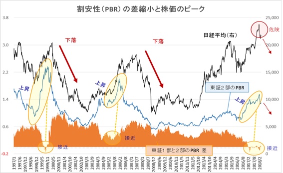 下記の図は、東証一部と東証二部のPBR(株価純資産倍率)の差に焦点をあて、その変動と日経平均株価との関係性を導き出そうとしたものである。