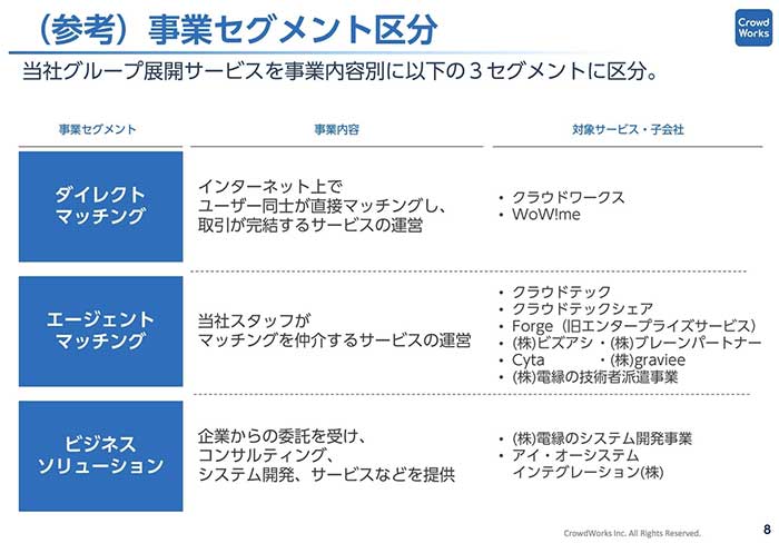 この成長スピードが加速している背景を詳しく見るために、まずはクラウドワークスの事業セグメントを見てみましょう。