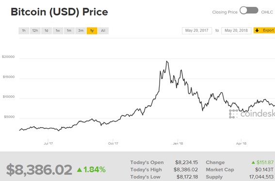 ビットコインのチャート(期間2017年5月20日~2018年5月20日)