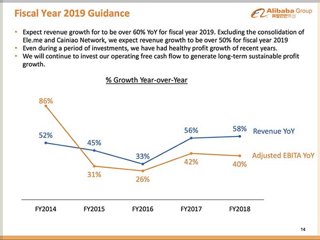 Alibabaがすごいのは、以下のグラフにある通り売上の前年同期比成長率(青い線)が全く落ちる気配がないというだけではなく、EBITDAの成長率(オレンジの線)も十分高い水準をキープしている点です。