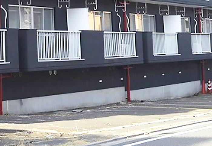 ※Before/Afterが動作しない方はコチラ続いてはこちらの写真。ビフォー物件だと各部屋のベランダには防鳥ネットが垂れ下がり、駐車スペースも鉄パイプによる柵、伸びっぱなしの雑草があり、とにかく見た目が悪い。