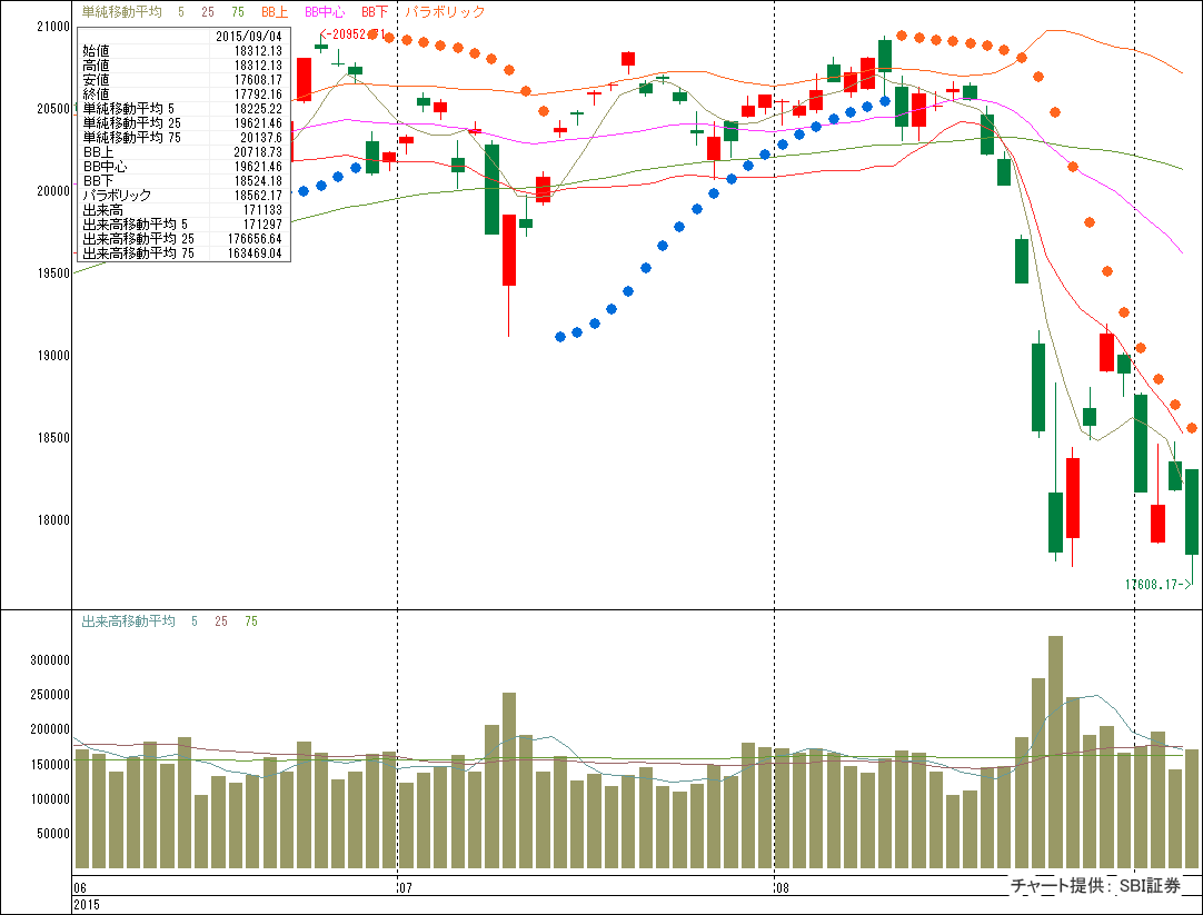 米雇用統計、G20財務省・中銀総裁会議に来週週明けの米国市場休場など重要イベントを前にポジションを手仕舞う動きが加速し、日経平均株価は一時500円を超える下げ幅に。取引時間中の安値では、先月8月26日の安値1万7714.30円を割り込む場面も見られました。終値でも前日比390.23円安の1万7,792.16円と、前営業日にも上値を抑えた5日移動平均線(1万8225.22円)とともに水準を切り下げています。