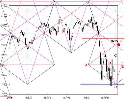 上値抵抗線ABEラインが効いている。また、先週末の終値は中心点C点の下方に位置している。また、トリプルトップ完成からの下落となっている。したがって、軟調な展開が続く可能性がある。下値のメドは青線表示の約17,500円前後。