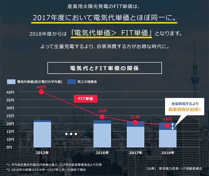 そして今、家庭や事業所で発電された電気を買い取る「固定価格買取制度(FIT)」が改定され、電気を売って得られるメリットは急激に減ってきています。