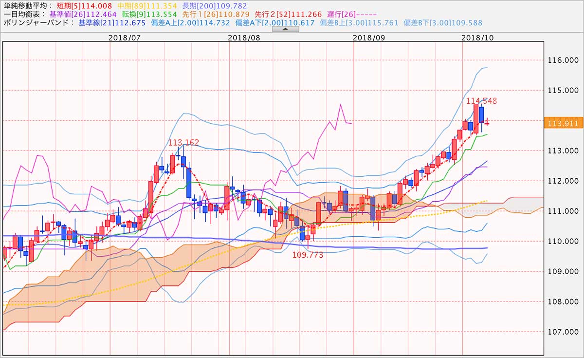 押し目のポイントは、トレンドラインや10月の安値、一目均衡表の転換線が重なる113.50円近辺や、上値の蓋となってレジスタンスとして機能している113.10~113.20円前後が挙げられますので、この水準では押し目でポジションを追加したい。