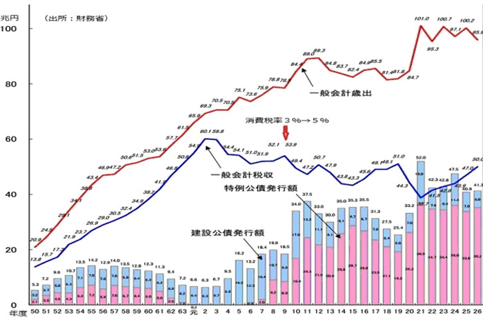 日本経済が元気で税収も大きかったのは、消費税率が3%だった頃までだ。5%への増税で、消費税収こそ安定して少しずつ伸びたが、所得税収、法人税収は激減した。100兆円の消費が税金で天引きされ、97兆円から95兆円の売り上げとなったために、経済が回らなくなったのだ。結果的に税収そのものが減り、財政は悪化し続けている。