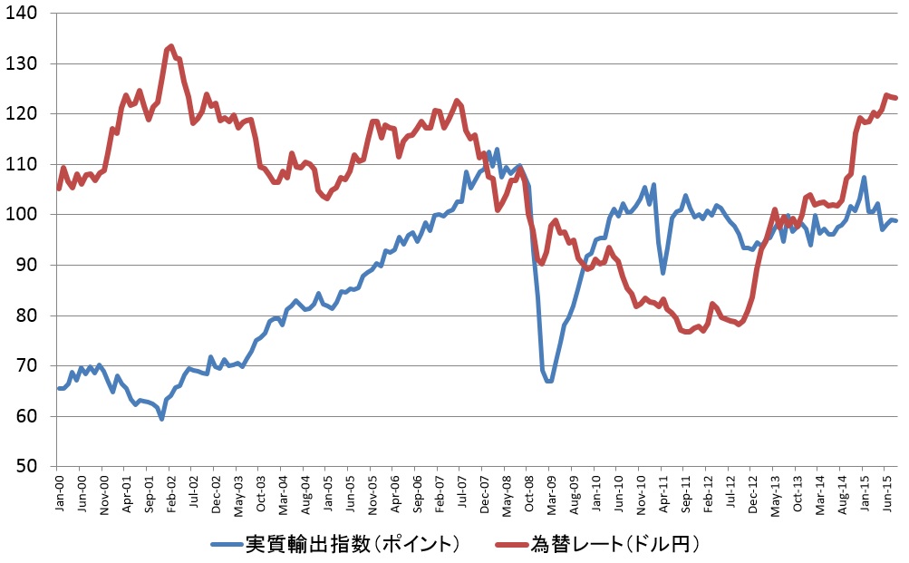 というわけで、日本の実質輸出と為替レートのグラフをアップデートしました。