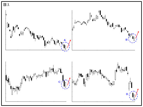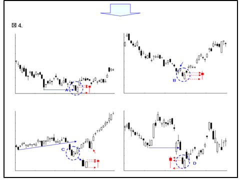 図4のAを見てみると底値圏でのもみ合いのなか、反発のタイミングを探していたところで青い矢印で示したように直前の安値を割り込み「もうだめだ、今度はどこまで下がるのだろう?」と思われるようなところで大き目の陰線を引き、本当に駄目だと思われたあとに大きめの陽線となって、「切り込み線」が出現、底値となったケースです。