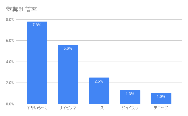 外食産業において規模を拡大させることは、購買力の強化につながります。同じ食材を大量に仕入れることによって、価格交渉をより有利に進めることができるのです。その結果、営業利益率はここに挙げた企業の中で最も高い水準となっています。