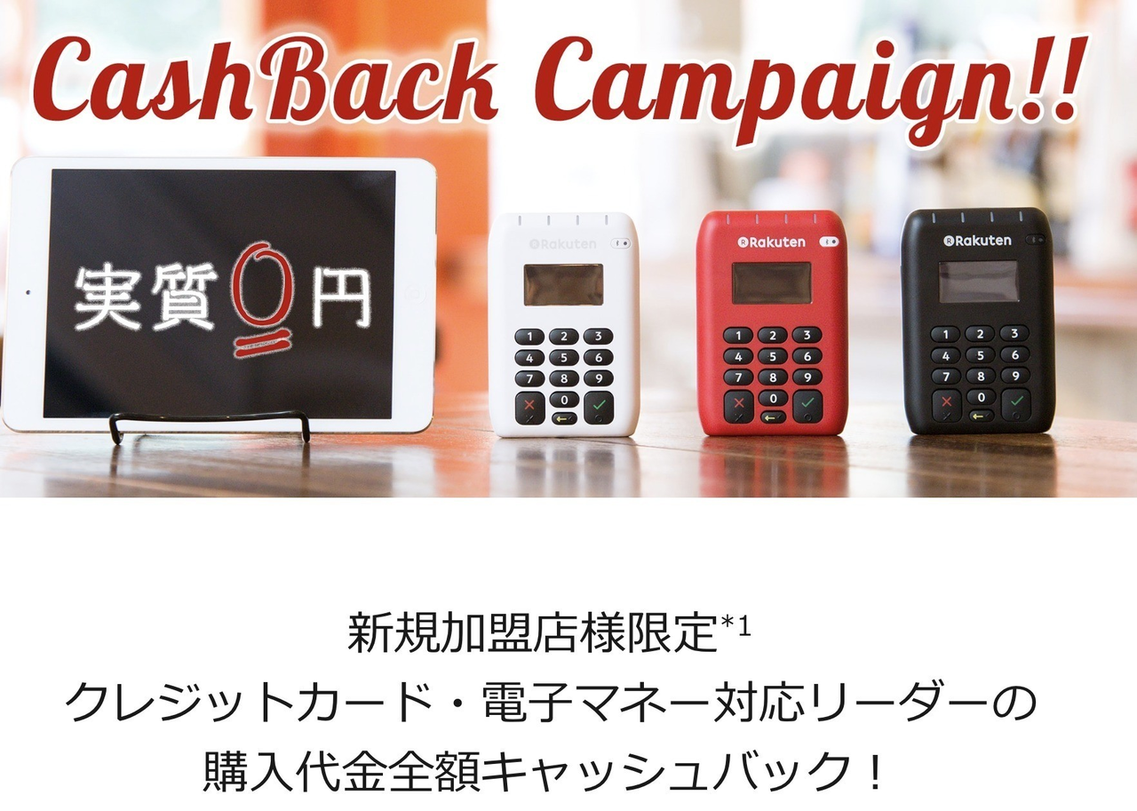 楽天Payは「条件を満たした店舗は決済端末の購入金額を全額キャッシュバックする」というキャンペーンを行っています。