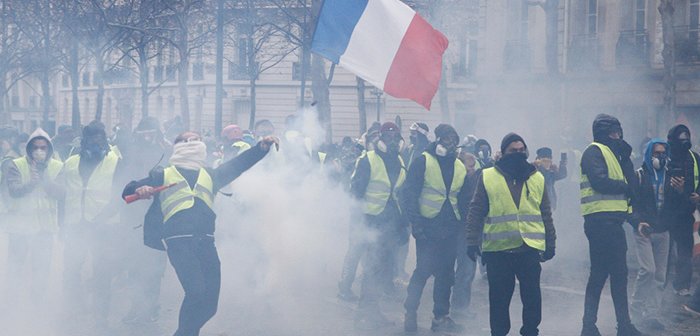 「黄色いベスト」運動は、マクロン大統領の増税・リストラ路線に反対するもので、燃料増税が直接のきっかけです。デモが行われたパリ中心部では、「黄色いベスト」を着た人に、街は埋め尽くされました。