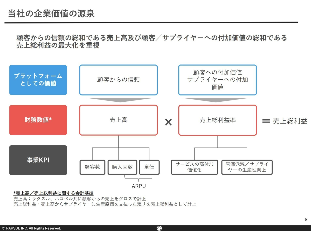 売上総利益率というのは顧客やサプライヤーへの付加価値である、と定義されており、売上総利益率を上げるためには、サービスを高付加価値化したり、原価低減や、サプライヤーの生産性向上に寄与する必要がある、と明確に定義されています。
