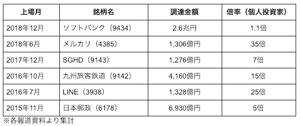 しかし、この1.1倍という数字は決して褒められたものではありません。IPOは上場後すぐに値上がりすることが多く、人気化しやすいものです。最近の大型IPOの個人投資家の需要倍率を見ても、メルカリ<4385>が35倍、JR九州<9042>が15倍、日本郵政<6178>が5倍に比べて、ソフトバンクの「不人気さ」が目立ちます。