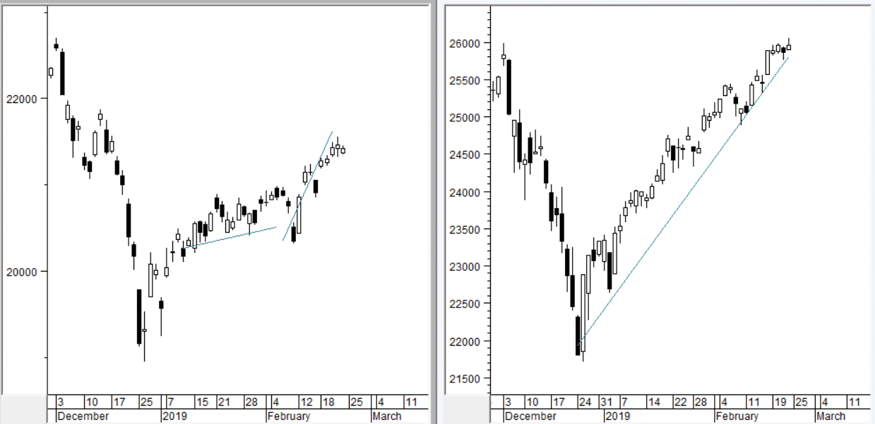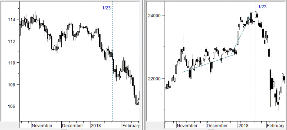 図表1は、1月から2月にかけての日経平均株価日足と同じ期間のNYダウ日足です。