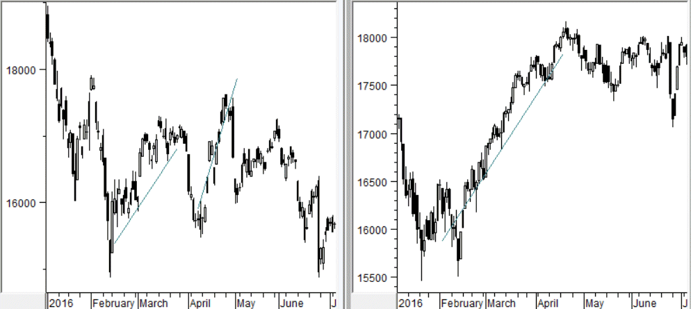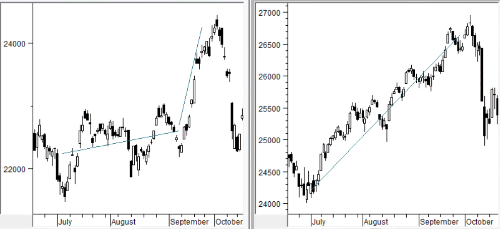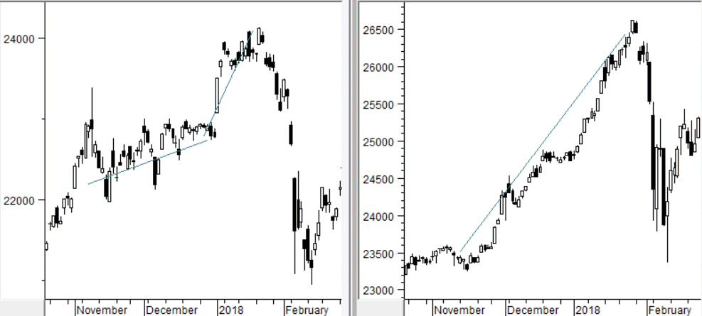2018年1月26日までの上昇の最終段階の上げは急速でした。このときは、2017年11月15日の安値2万3,242ドルから、2018年1月26日の高値2万6,616ドルまで、49営業日で3,374ドル幅の上昇となっています。速度は、1営業日68.8ドルの上げの速度です。