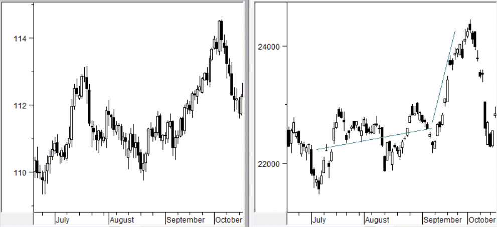 過去に似た展開を探すと、2018年7月から10月上旬にかけて(図表2-1を参照、図表2-2は日経とドル・円の比較です)、2017年11月から2018年1月にかけて(図表3-1、3-2を参照)、