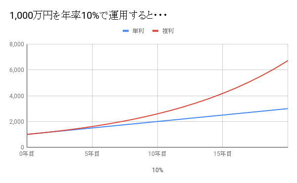 例えば、1,000万円の元本で年率10%のリターンをあげたとすると、再投資により翌年の元本は1,100万円となります。すると、2年目には1,210万円(1,100*1.1)となり、利益を元本に加えない場合(単利)よりも10万円多くなります。