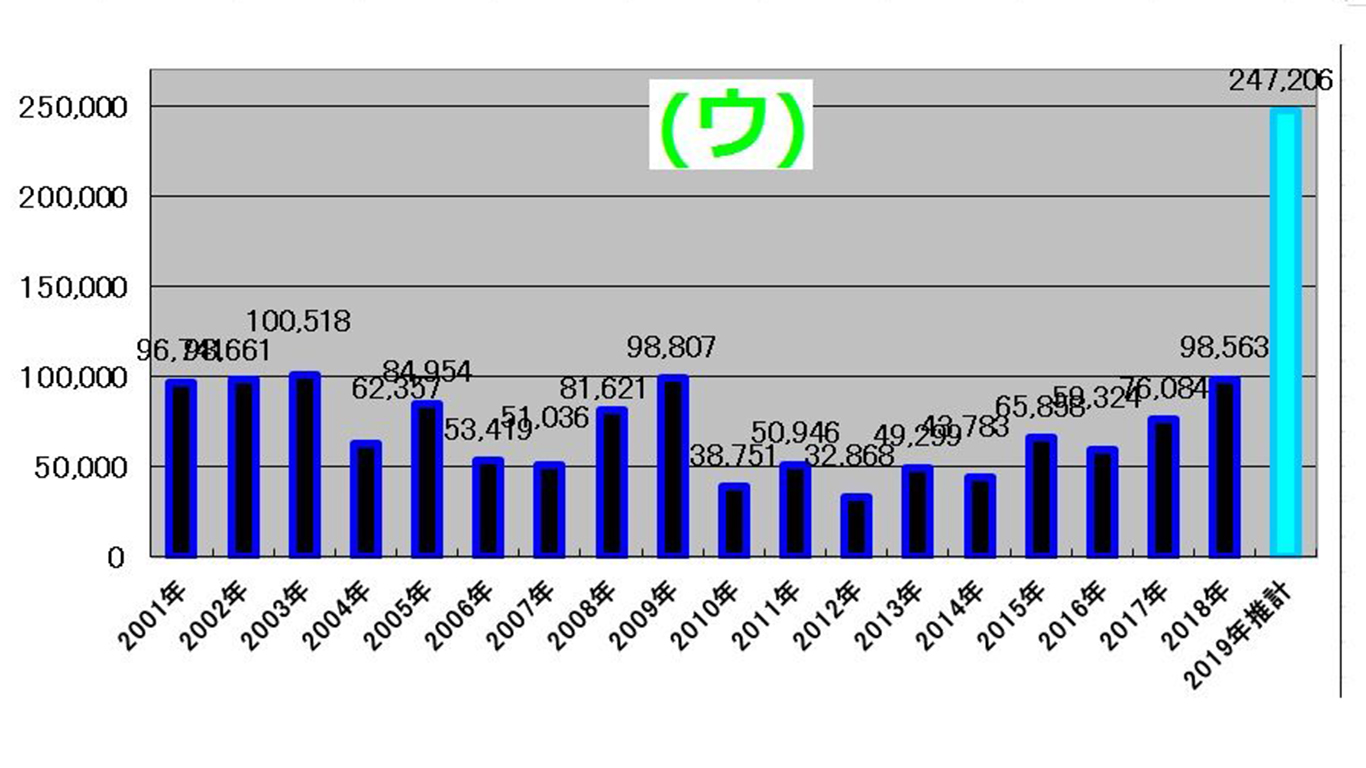 1月に関していえば、2018年は約1万5,400人、それが2019年は約2万2,300人に増え、2月に関していえば、2018年は約6,100人程度が、2019年には3倍以上の約1万8,900人に大きく増加しています。昨年の年間合計は約9万9,000人。今年の2カ月だけで、もう4万1,000人ですから、環境は非常に悪いのです。