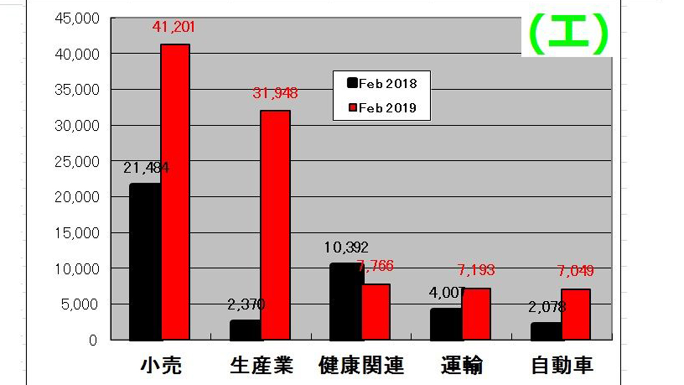 (エ)この2月の解雇予告人数の上位5業界は、小売業界、工業製品製造業、健康関連業、運輸業界、自動車業界でした。昨年の2018年2月と2019年2月のこのトップ5業界の解雇人数を示しています。数字は解雇通知を貰った人数です。