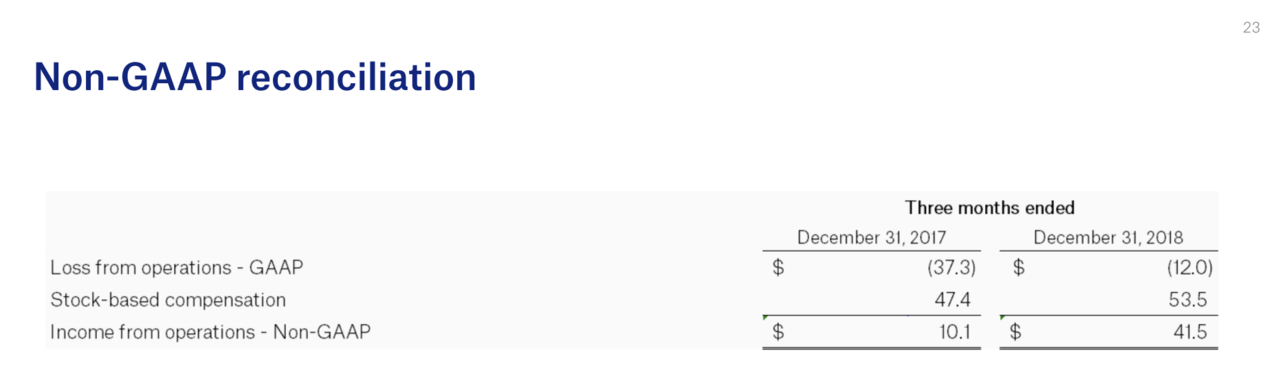 上の表を見ると、営業利益が△$12M(約△12億円)となっており、GAAPベースでは赤字の会社ですが、ここは少し注意が必要です。