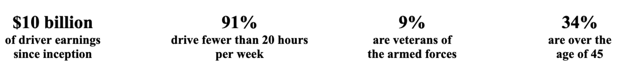 こちらがドライバーを表す特徴的なデータです。91%のドライバーは週に20時間以下だけLyftの仕事をしています。そしてドライバーの34%が45歳以上です。