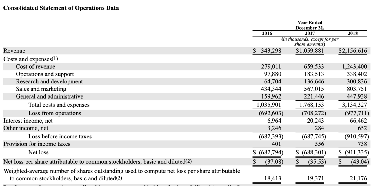営業利益は2018年の1年間で▲$911M(▲約911億円)で前年より赤字が大きくなっています。売上の半分程度の赤字を計上しているので、非常に大きな赤字にも見えますが、成長スピードとのトレードオフとも考えられるのではないでしょうか。