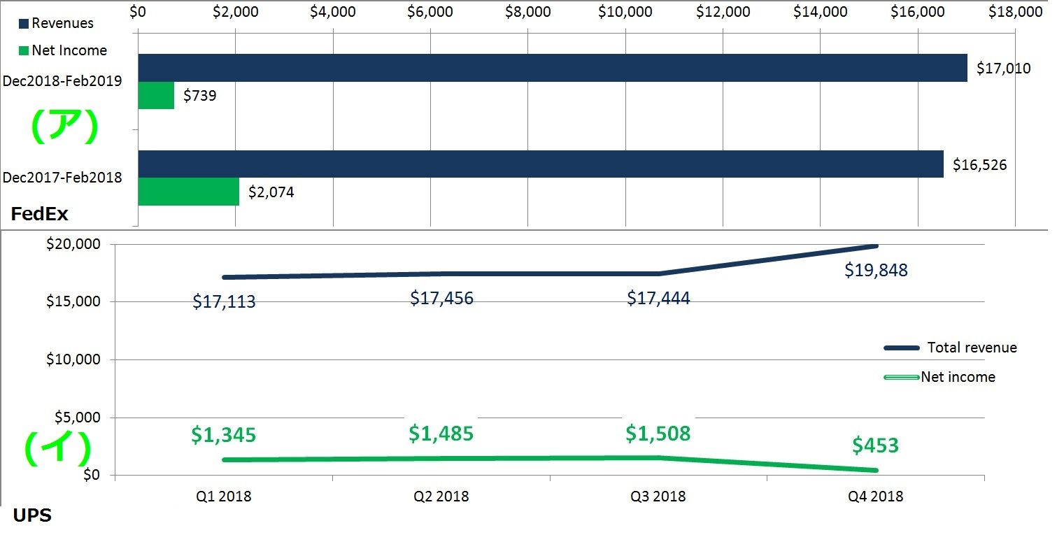 (ア)まずはFedEx社の収益と利益です。2017年12月から2018年2月末までの四半期の収益は16.5B$だったのに対し、最新の2018年12月から2019年2月末までの四半期の収益は17.0B$と増えているのだが、他方で、純益は2.1B$から0.7B$へと66%も減っています。増収減益です。