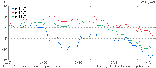 業界全体の問題であるため、NTTドコモ<9437>、KDDI<9433>も値下がりしています。その中でもソフトバンクは、この3ヶ月で10%超の下落です。