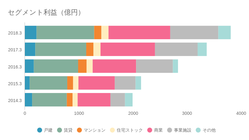 以下のグラフが、セグメントごとの利益の内訳です。戸建て住宅の割合は小さく、利益の大きい方から商業施設、賃貸住宅、事業施設の順となります。ハウスメーカーと言うよりは、総合建設メーカーと言ったほうが適切でしょう。