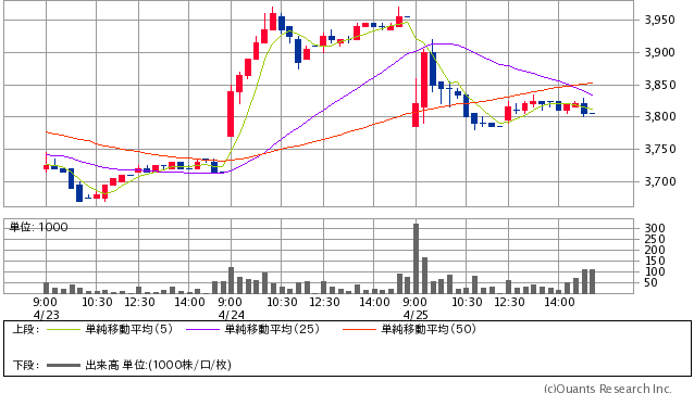 決算発表から明けて25日、株価は前日引値から5.5%下げの3,785円でスタート。一時前日引け値付近の3,920円まで買われたものの、3.79%安の3,805円で引けました。現状利益が出ていないだけに評価の難しいLINE株ですが、GWの10連休も控え、次の決算に向けて一旦は様子見となったようです。