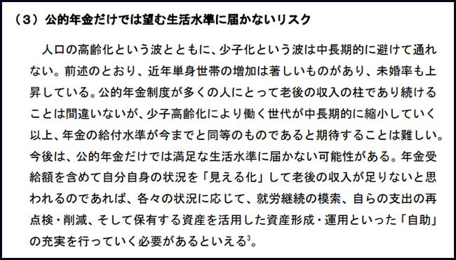 正確な詳細はこちらのPDFでご覧いただけますが、ごくごくかいつまんでその中身を言えば、少子高齢化が現実のものとなり年金の給付水準を維持することがもはや困難であることを明言しています。