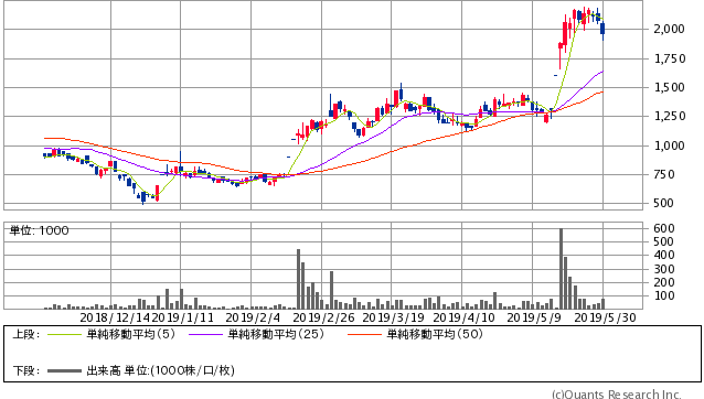 株価は2回目の上方修正も好感して急伸している。目先的には過熱感だが、自律調整を交えながら15年7月の上場来高値2,825円を目指す展開を期待したい。5月29日の終値は2,081円、今期予想連結PER(会社予想連結EPS35円27銭で算出)は約59倍、前期実績連結PBR(前期実績連結BPS185円47銭で算出)は約11倍、時価総額は約106億円である。