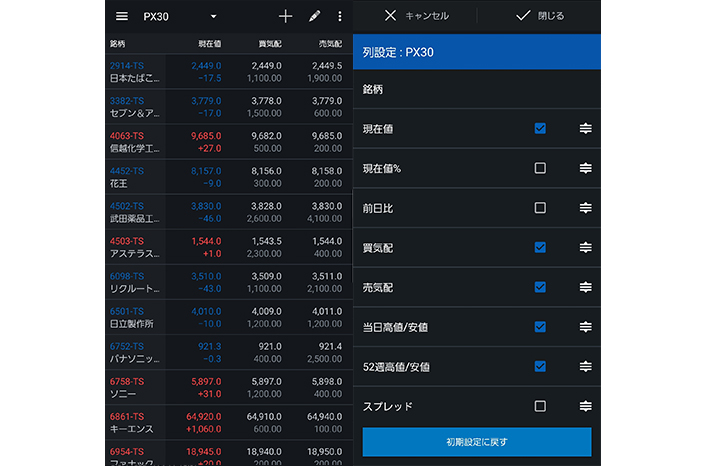 現在値や買気配、売気配、当日高値/安値などの11項目のうち表示したいものだけを、自分の見やすい順番に簡単に並べ替えることが可能。リストごとに目的に合わせた設定をすることもできます。
