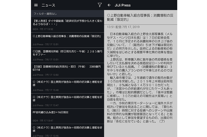 四季報続報、時事通信、GI24、みんかぶが配信するニュースをリアルタイムで受信。銘柄/キーワードでフィルター設定することもできます。