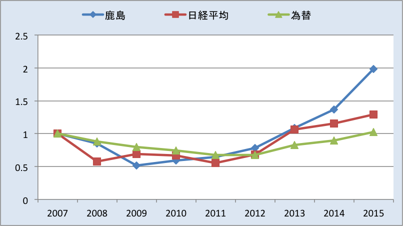 為替の下方への振れは円高を意味しております。2007年から2012年まで続く円高の動きに日経平均は抑えられておりますが、これは東証上場企業全体が円高により業績が低迷した時期でもあります。鹿島の株価も低迷しております。鹿島の利益(EPS)の動きを示しておりますが世間一般の不況から鹿島の利益も低迷しており間接的に円高の影響を受けているようです。