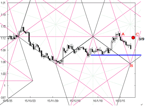 上値の重たい展開が鮮明になっていく可能性がある。B点が位置するペンタゴンのど真ん中の時間帯にかけて同事線が頻発し、下げ止まると思いきや、ど真ん中の時間帯に大きな陰線が出現した。また、上値抵抗線ACラインも控えているからである。下値のメドは青線表示の1.075ドル前後。