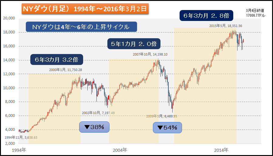 NY株価が昨年5月の18,300ドルを以て大天井を既に付けたと本稿で昨秋来から述べたのは、単純な根拠からだった。今までNYダウが大相場になった6回の内、日柄は4年~6年、上昇率は2倍半~3倍、という単純な事実からであった。
